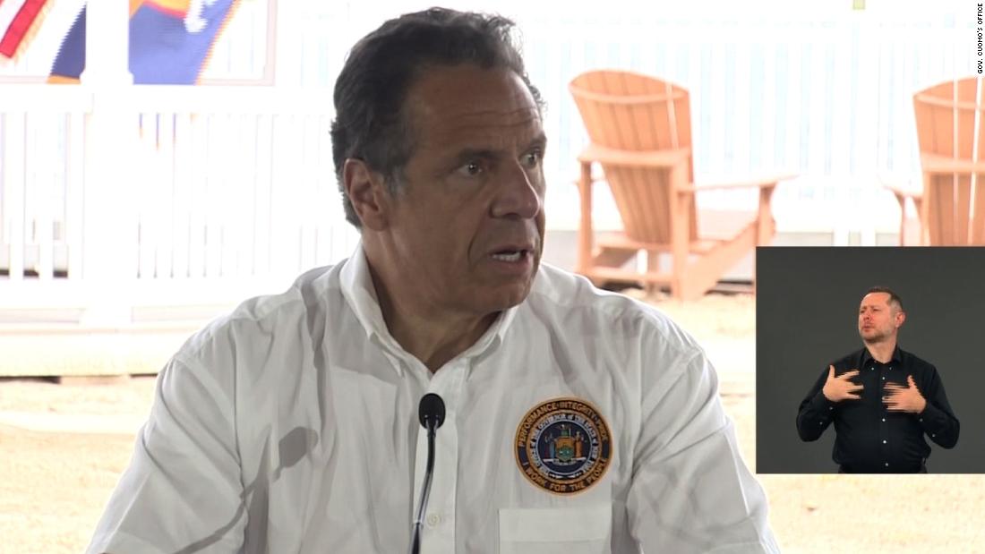 New York Governor Andrew Cuomo speaks at a press conference at the Theater at Jones Beach in Long Island on May 24. Cuomo’s office criticized Dublin Deck Tiki Bar and Grill for allegedly easing restrictions on masks and social distancing for its customers because of rainy weather on Friday. Bryan R. Smith/AFP/Getty Images