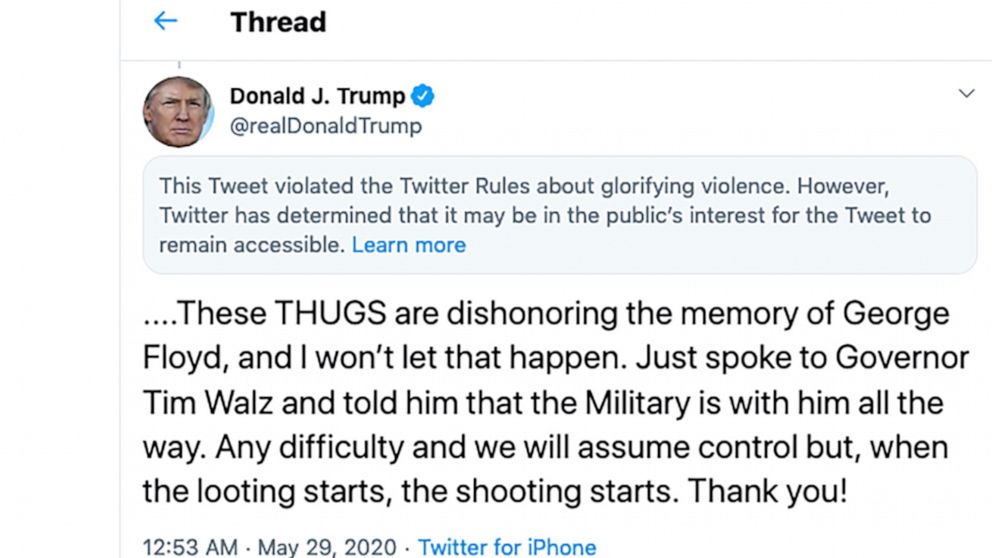 WASHINGTON — Twitter has added a warning to one of President Donald Trump‘s tweets about protests in Minneapolis, saying it violated the platform’s rules about “glorifying violence.”