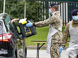 Soldiers from the Royal Logistics Corp operate a mobile coronavirus testing site at Evington Leisure Centre in Leicester today, with one pictured carrying a box for drivers to put their Covid-19 swabs in