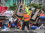 - Pictures show trash and debris being collected by city workers with tents and protest signs taken down