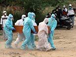 Relatives wearing personal protective equipment carry a coffin into a grave during a funeral service for a Covid-19 victim in New Delhi, India