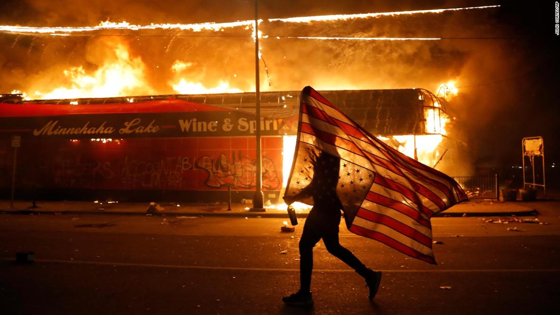 A protester carries a US flag upside down, a sign of distress, next to a burning building on May 28, 2020, in Minneapolis.