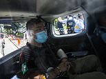 Mr Tong, who carried a ‘Liberate Hong Kong’ sign as he drove a motorcycle into police at a protest against the territory’s Chinese rulers, became on Frida the first person charged with inciting separatism and terrorism under the new security law. He is pictured on Monday