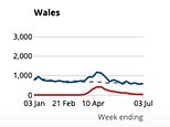 The report said: ‘The number of death registrations involving the coronavirus (Covid-19) decreased from 606 in Week 26 to 532 in Week 27, the lowest number of Covid-19 deaths registered since Week 12, week ending March 20, when 103 deaths involved Covid-19.