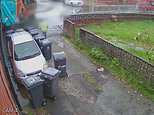 This is the bizarre moment ‘bullying’ dustmen are caught on CCTV surrounding a family car with 11 black bins ‘during a decade-long row about where to leave them’.