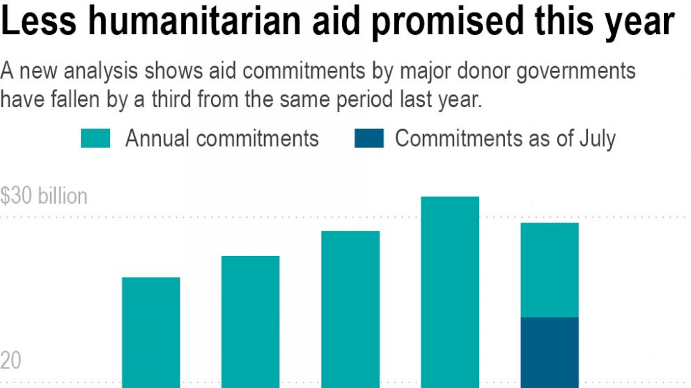 During the first five months of this year, overall aid commitments from the largest government donors were $16.9 billion, down from $23.9 billion in the same period last year, according to the new analysis, which drew on data from the United States, the United Kingdom, European Union institutions, Germany, France, Canada and others.