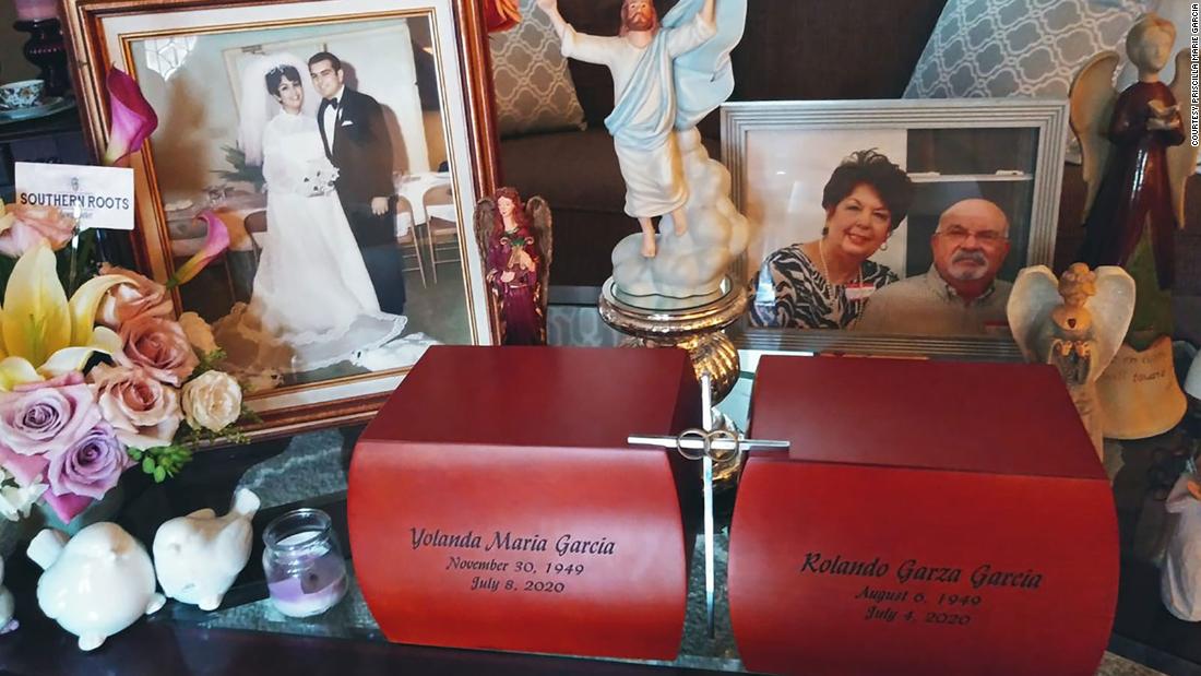 Priscilla built the shrine to her parents in their San Juan, Texas, home as her family waits for the worst of the coronavirus pandemic to pass so they can safely hold a memorial service.