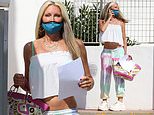 Dressed in tie dye trousers and a crop top and wearing a face mask, the model looked distressed as she left the courthouse with paperwork.