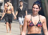 PICTURE EXCLUSIVE: Dua Lipa shows off her toned abs in a bikini and shorts as she and Anwar Hadid spend her 25th birthday at the beach in Malibu with friends and their new puppy
