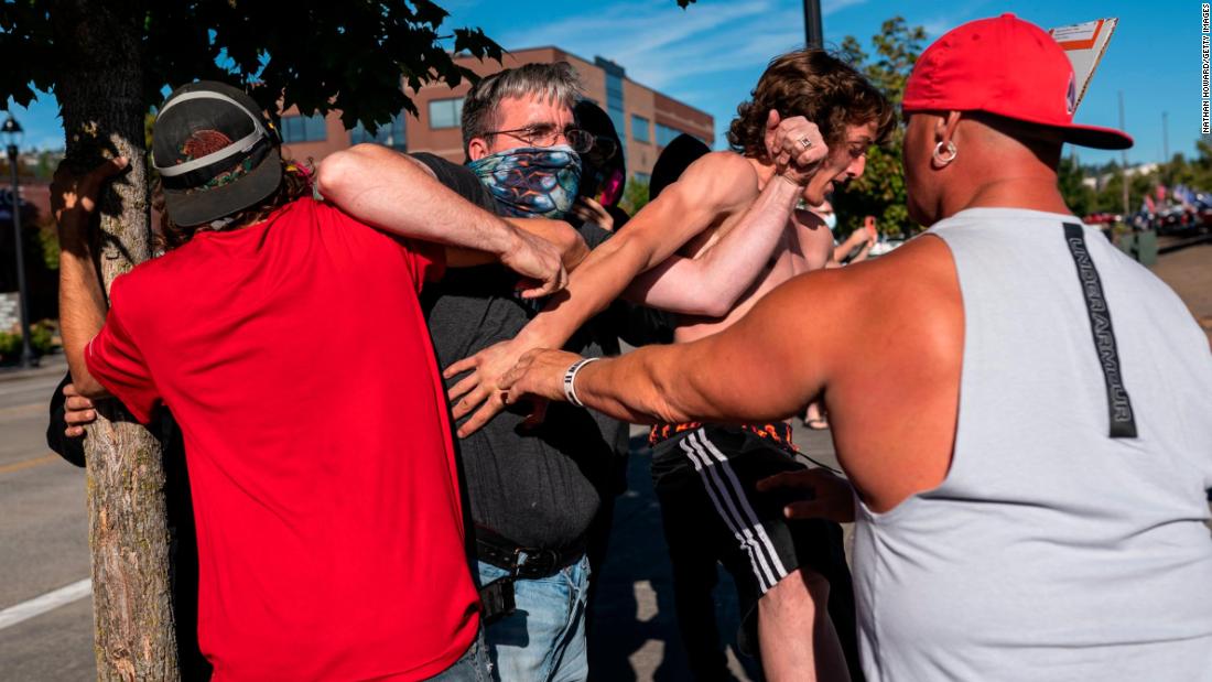 A Black Lives Matter protester scuffles with attendees of a pro-Trump rally during an event held to show support for the president on Saturday in Clackamas, Oregon.
