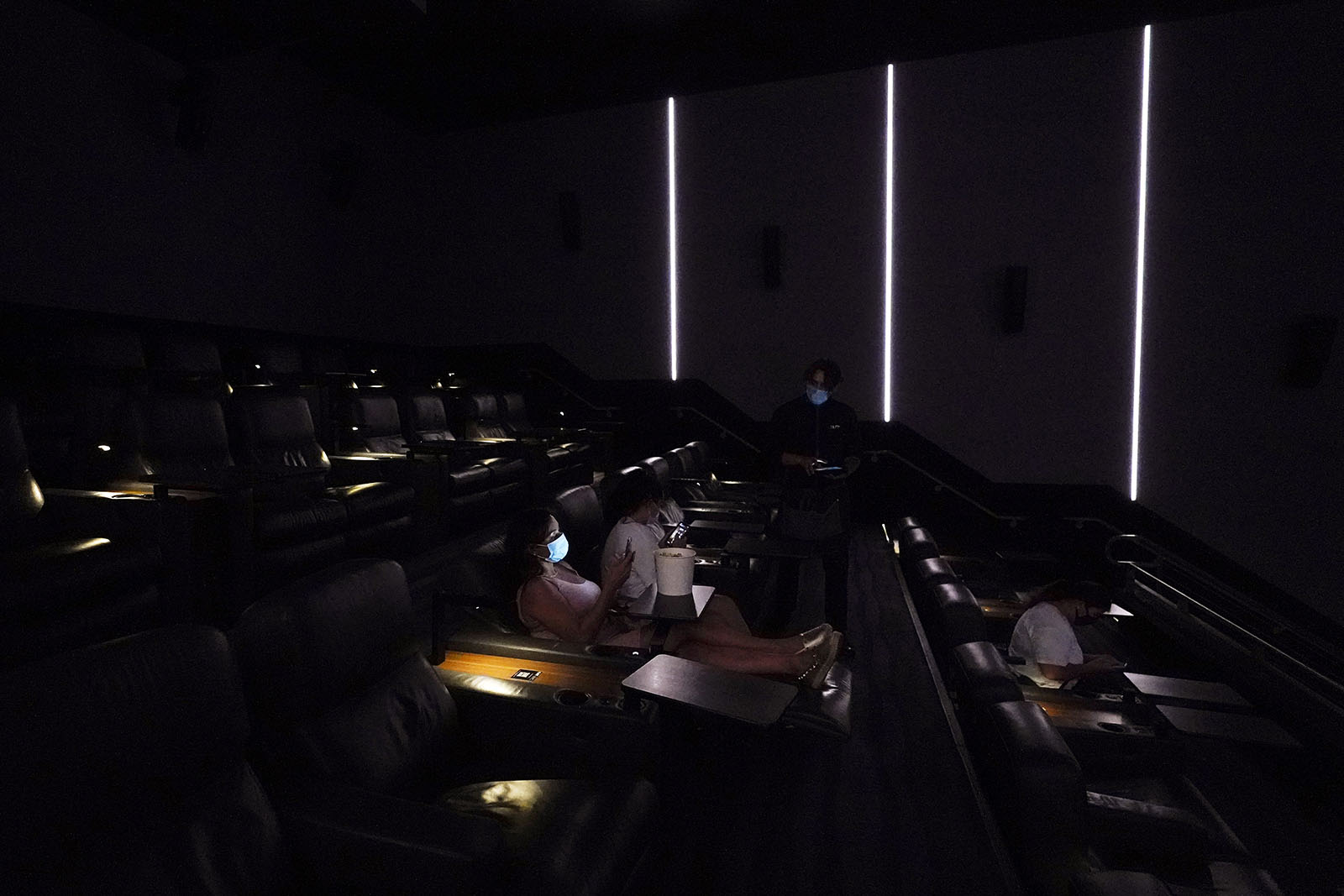 Nancy Killebrew checks her phone as she waits with her daughter Melody for the start of a movie at The Lot on Thursday, Sept. 3, in San Diego. Gregory Bull/AP