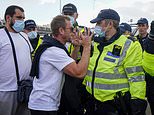 Police officers wearing face coverings speak to a protester as other appear to be shouting during the Dover demonstrations