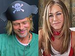 Jennifer wore a red bikini top over a white tank top for the scene during the live virtual table read and Brad brought a pirate hat for his character’s fast-food restaurant employee costume.