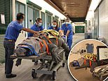 Staff at the alligator farm strapped the scaly patient to a long wooden board, tied his jaws shut and covered his eyes with a towel. Bob is pictured arriving at University of Florida’s College of Veterinary Medicine