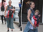 During her luxury getaway the new mother was seen cutting a casual figure in a £325 blue checked cotton gingham dress by Ganni and black Superga trainers as she wandered along the waterside esplanade with a friend while carrying five-month-old Wilfred in an Ergobaby 360 All Positions Baby Carrier.
