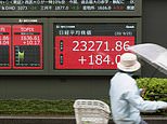 A woman rides a bicycle past screens showing Japan’s Nikkei 225 index in Tokyo today