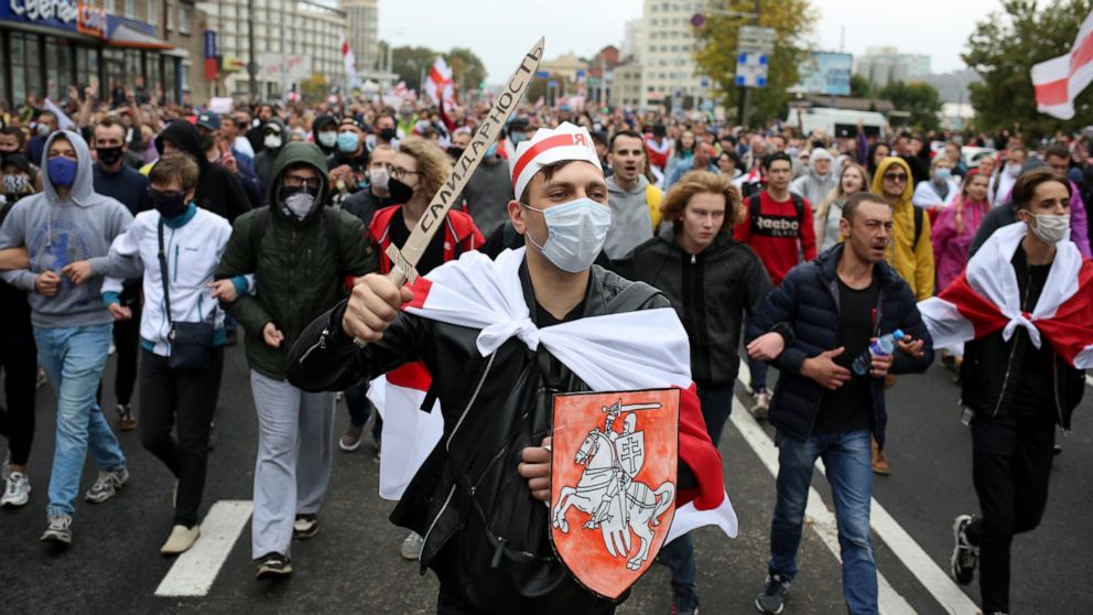 KYIV, Ukraine — About 100,000 demonstrators marched in the Belarusian capital calling for the authoritarian president’s ouster, some wearing cardboard crowns to ridicule him, on Sunday as the protests that have rocked the country marked their 50th consecutive day.