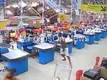 Shocking moment towering shelves in Brazilian supermarket collapse on top of each other in domino effect crushing one worker to death and leaving eight others injured