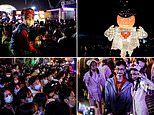 Some revellers swapped face masks for spookier options and there was no sign of social distancing as people posed for photos together and queued to see a Halloween show.