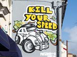 The street-style artwork shows the VW Beetle movie character Herbie and the words ‘Kill your speed’.