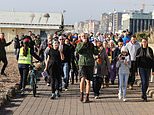 Protestors walk along Brighton seafront this afternoon as they take part in a demonstrationn