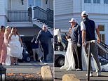 The president had just got off his golf cart and was making his way inside the club house when he ended up walking by a wedding party photoshoot which he then joined in.