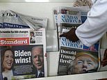 After four days of anxious anticipation, the results of the US presidential election finally hit newstands around the world on Sunday morning as media outlets praised Donald Trump’s defeat while warning of foreign policy changes to come under Joe Biden. Pictured: Newspapers are arranged on a shelf in Kenya on Sunday morning