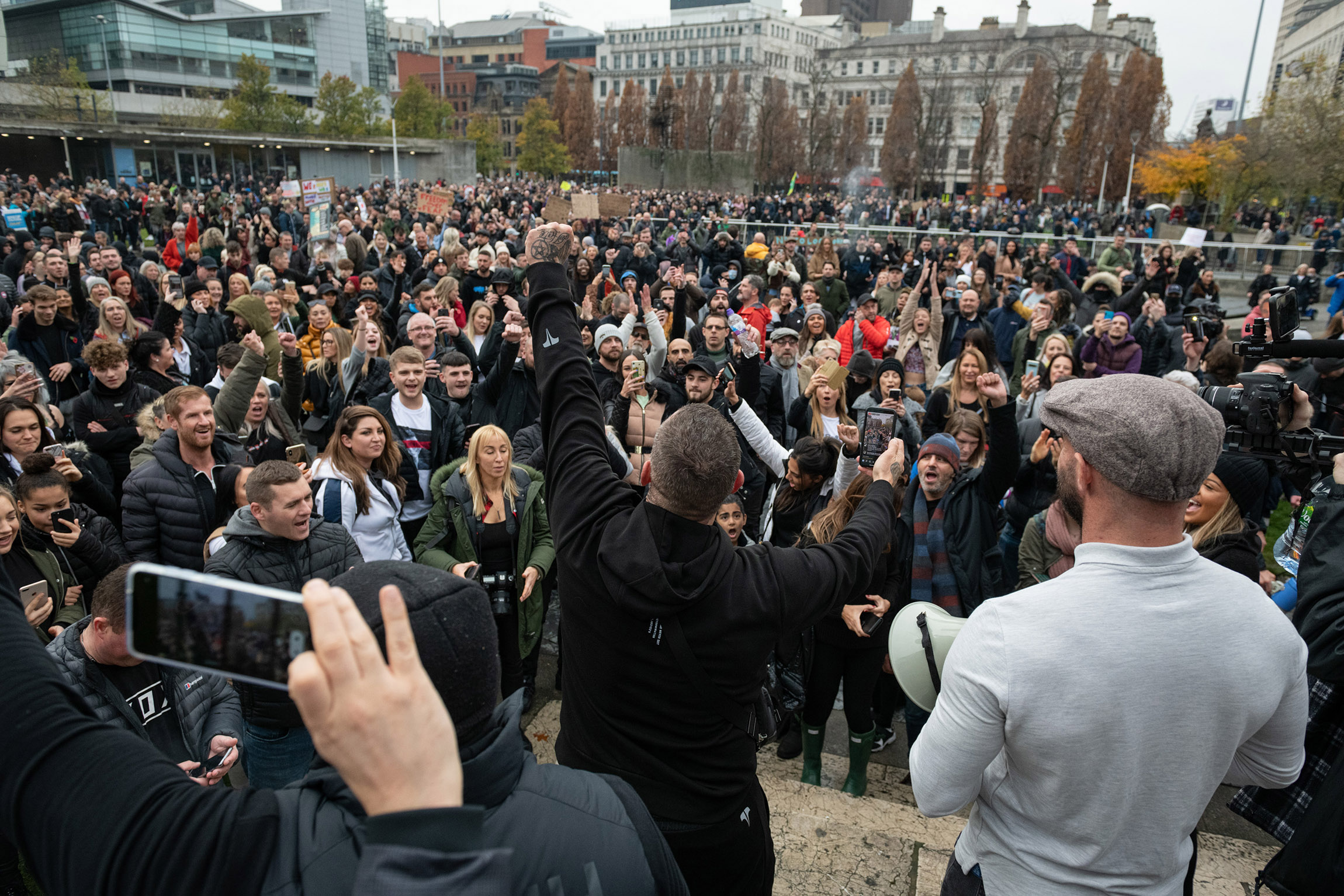 More than 600 people gathered in the center of Manchester, in northern England, at the weekend to protest a new national lockdown that requires the closure of bars, restaurants, and non-essential retail, and forbids household mixing until December 2.