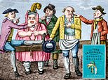 Ian Mortimer reveals contrasts between rich and poor between 1789 and 1830 in a new book. Pictured: 1797 cartoon shows a husband displaying his wife to would-be buyers at London’s Smithfield market