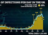 Britain today recorded 40 per cent fewer coronavirus cases than a week ago in another sign that England’s lockdown is working as 11,299 more positive tests were declared – but deaths are at a six-month high.