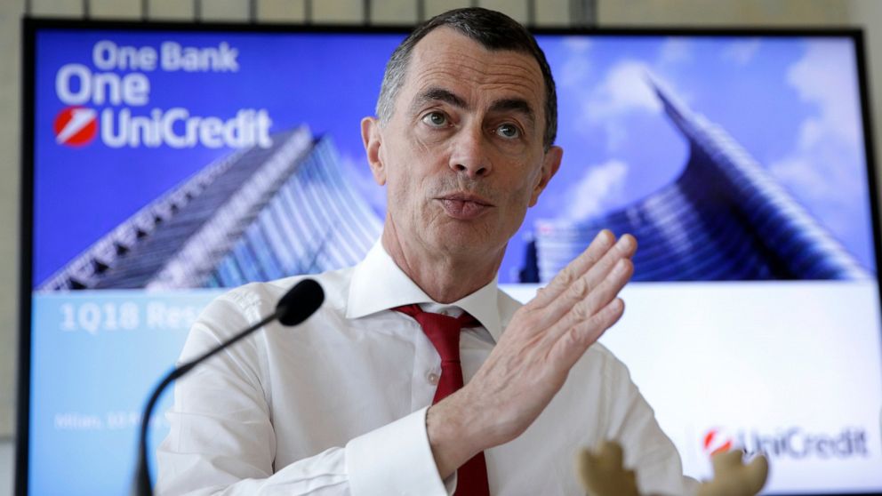MILAN — Shares in Italian bank UniCredit sank 7% on Tuesday after the bank unexpectedly announced that CEO Jean Pierre Mustier is leaving in April due to strategy differences with the board.