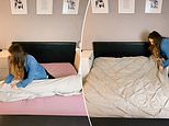 Sophie Liard, from the UK, posted a video to TikTok demonstrating her method for changing a duvet cover. Pictured, sitting at the top of her bed with an inside-out duvet cover positioned underneath her duvet