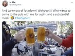 Jo Mac, a Twitter user, said: ‘And we are out of lockdown! Wohoooo!!! Who wants to come to the pub with me for a pint and a substantial meal?’