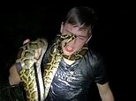 Footage shows David Orin Humphlett, 21, jumping into the water after a Burmese python and wrapping the animal around his neck. He rates snake bites from one to ten based on their pain