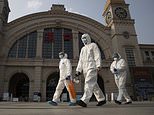 Pictured: Workers in protective suits walk past the Hankou railway station in Wuhan in China’s Hubei province, April 2020. Wuhan is belieed to have been where the Covid-19 outbreak, that sparked the global pandemic, began. The first case was reported on December 31, 2019
