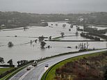 River bursts banks turning fields into LAKES and submerging train lines as three weeks of rain falls in a day in Britain putting 129 areas at risk of flooding