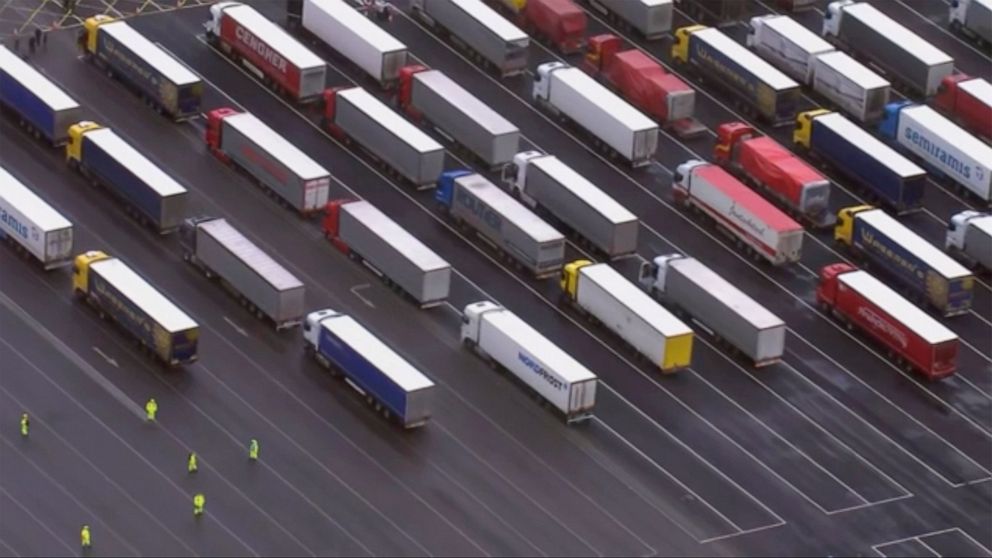 The company that runs the Eurotunnel said Wednesday that truck drivers lined up on the highway leading to the English port of Dover are being tested for the virus, but that it may take some time to for traffic to resume as normal after massive backup.
