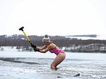 Swimmer Nicky Goode uses a sledgehammer to break the ice at Loch Insh near Aviemore in the Scottish Highlands