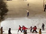 Skier dangles from chairlift by her JACKET before rescuers catch her in a tarpaulin when she finally loses her grip