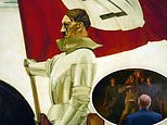 Among the chilling paintings is 'Der Bannertrager,' or the 'Standard Bearer,' which depicts Hitler on horseback in the armor of a Teutonic knight, carrying the Nazi flag. A U.S. soldier thrust a bayonet through Hitler's face when the painting was captured