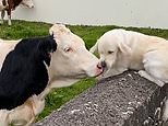 Adorable moment excited golden retriever licks face of cow after pair struck up unusual friendship