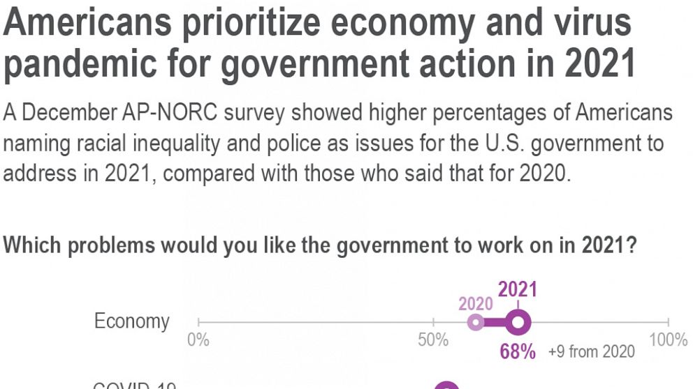WASHINGTON — Containing the coronavirus outbreak and repairing the economic damage it has inflicted are the top priorities for Americans as Joe Biden prepares to become the 46th president of the United States, according to a new poll from The Associated Press-NORC Center for Public Affairs Research.