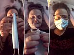 The mother-of-three adjusted the mask to her face (left) making sure it was tightly put on and adjusted the pliable strip (right)