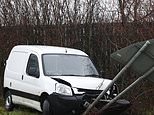 A van that has crashed into a road sign near Bramham, West Yorkshire, as Storm Christoph is set to bring widespread flooding, gales and snow to parts of the UK