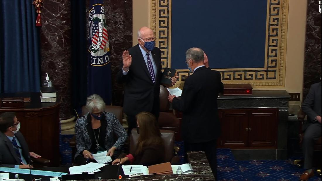 The trial began Tuesday afternoon with the swearing in of Sen. Pat Leahy of Vermont, the Senate president pro tempore, who will preside over the trial. Leahy then swore in the rest of the Senate, and senators went four at a time to sign an “oath book” as jurors for the trial.