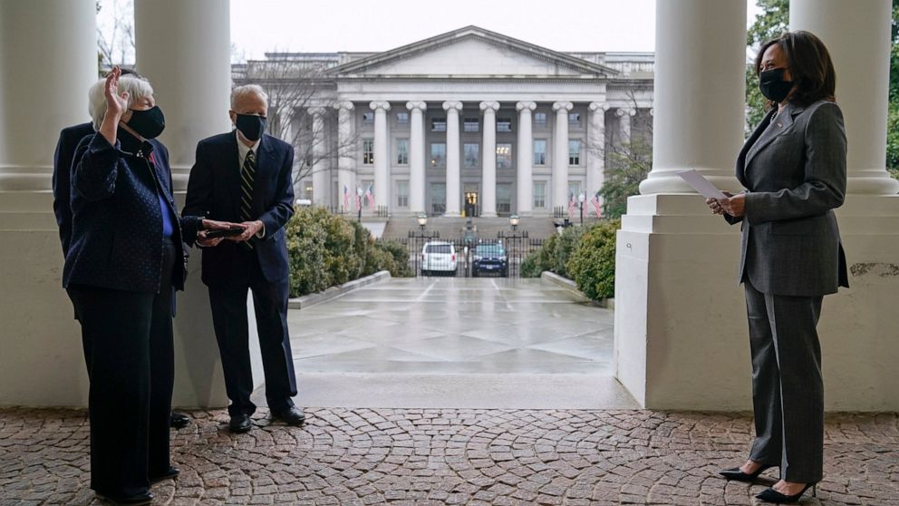 She was sworn in by Vice President Kamala Harris, the first woman elected to the position, at a ceremony performed outside on the East Wing entrance to the White House in view of the department Yellen will now lead. Yellen’s husband, George Akerlof, winner of the 2001 Nobel prize in economics, and their son Robert, also an economist, were present for the brief ceremony.