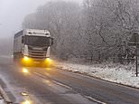 A lorry drives through a wintry landscape on the A44 in Powys, Wales today as Britain braces for heavy snow this weekend