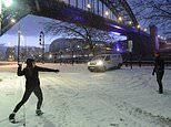 Two joggers take a break from their early morning run to throw snow balls at each other under Newcastle’s Tyne bridge this morning