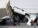 The crash site stretches for 1.5 miles along the freeway and traffic is backed up for miles. Authorities are describing it as a ‘mass casualty incident’. It includes cars stuck beneath 18-wheelers and pick-up trucks.