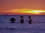 Early morning swimmers enjoy a prime view of a glorious sunrise over the North Sea today at Cullercoats in North Tyneside